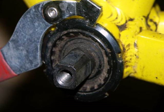 2. Тепер беремо ключ для каретки (шлицевой або спеціальний, в залежності від конструкції Вашої каретки. На фотографіях показано шлицевой.) вставляємо його в пази, і вивертаємо з рами ліву чашку-адаптер розвідним ключем з ручкою достовірніше. Вона має праву різьбу. При відверненні, можливо, доведеться прикласти значне зусилля.