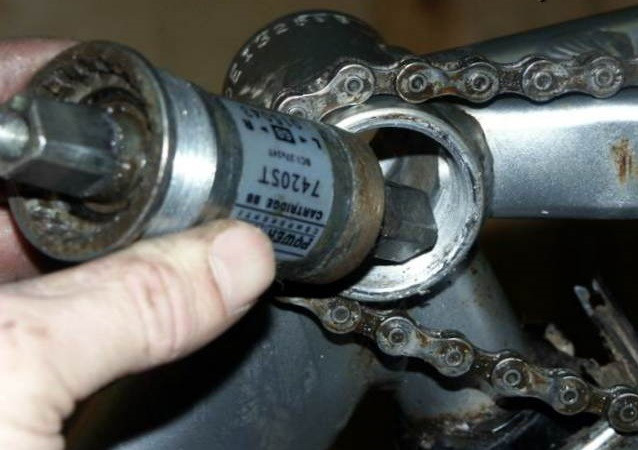1. Починаємо з правого боку. З допомогою ключа для каретки та розвідного ключа ввинчиваем каретку в раму до упору. Момент повинен бути 50-70 Нм.